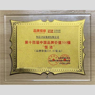 獎 項:第十四屆中國品牌價值500強-恒潔