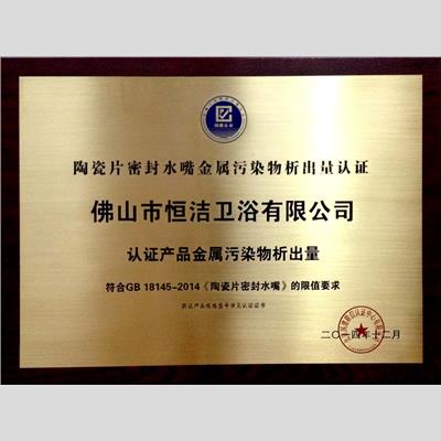 獎 項:陶瓷片密封水嘴金屬污染物析出量認證 佛山市恒潔衛浴有限公司 認證產品金屬污染物析出量 符合GB 18145-2014《陶瓷片密封水嘴》的限值要求