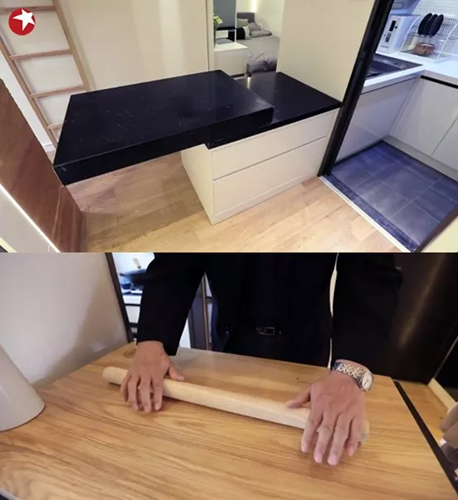 設計師親自前往爺爺奶奶的家鄉甘肅張掖后,切身體會到了面食對于他們的重要性,了解到一個面積足夠大的搟面臺,對于爺爺有多重要。于是設計師根據爺爺的使用習慣,量身定制了一張折疊式面臺,讓爺爺可以充分釋放對于面食的熱愛。