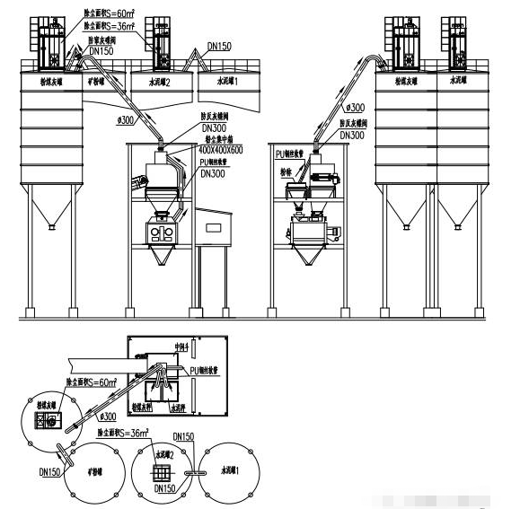 4、徹底解決主樓內的生產揚塵問題。主樓生產過程中產生的粉塵,通過PU鋼絲軟管管道,集中至砂石待料倉頂部的粉塵集中箱,然后通過倉頂除塵器上的風機和∮300管路,將粉塵全部抽到粉煤灰倉內,再經過除塵器過濾反吹后直接落入粉煤灰倉。