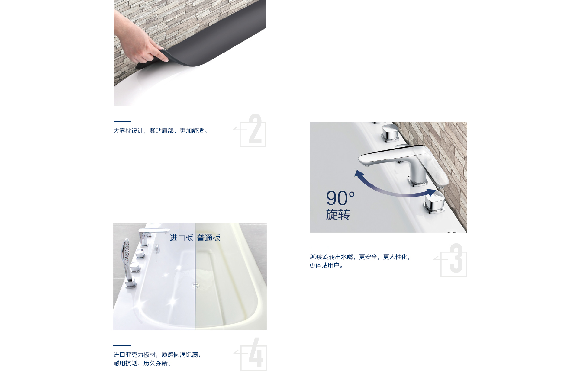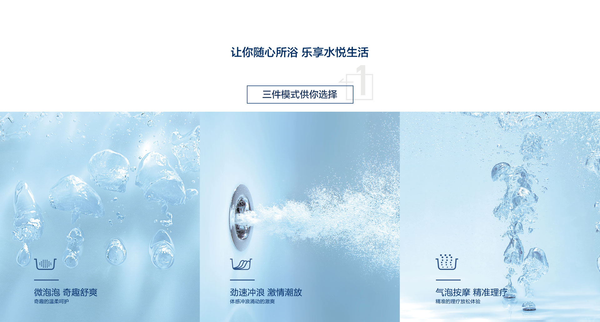 水療獨立按摩系統(tǒng)、勁速沖浪按摩系統(tǒng)、微泡泡按摩系統(tǒng)及汽泡按摩系統(tǒng)三件模式供你選擇,讓你隨心所浴,樂享水悅生活