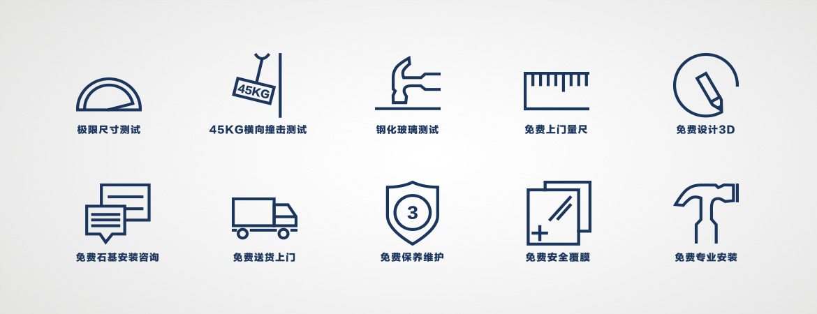 我們對(duì)每一片玻璃都進(jìn)行全鋼化并安全覆膜保護(hù),確保產(chǎn)品結(jié)構(gòu)牢固并經(jīng)得起外力和時(shí)間的考驗(yàn)。
